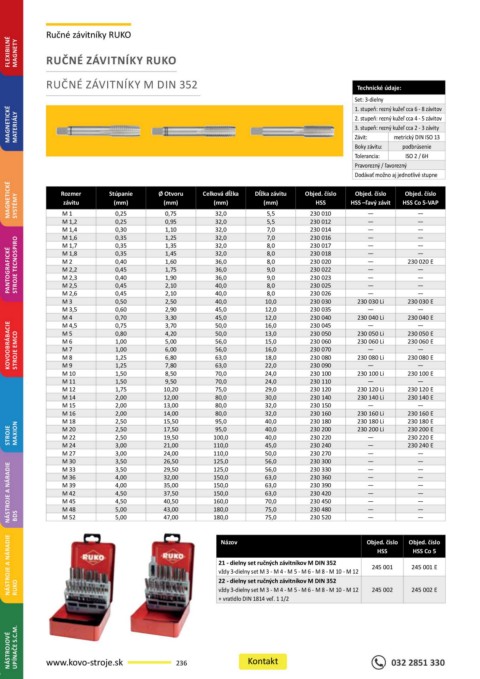 NÁSTROJE A NÁRADIE 21 - dielny set ručných závitníkov M DIN 352 Objed. číslo Objed. číslo